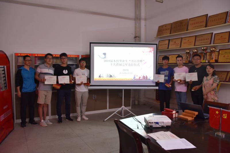 在2018毕业季来临之际,为表彰在校期间热爱读书的毕业班读者,给他们即将结束的大学生活留下更多美好回忆,培育浓厚的校园读书氛围,作为纪念第二十三个“4.23”世界读书日系列活动的一项重要内容,图书馆于近日开展了借阅之星评选活动,根据对2018届本科毕业生读者借阅情况的统计,评选出了装备141朱效恒等十名毕业班读者为“书山有路” 十大借阅之星,并于6月7日下午在图书馆会议室举行了表彰仪式。