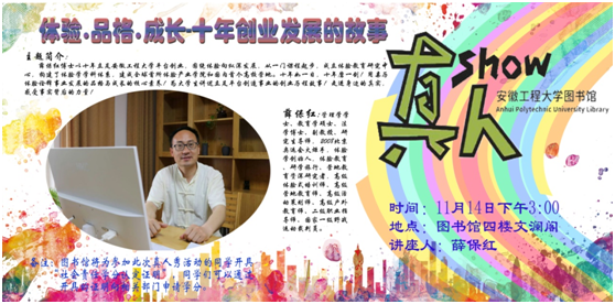 在第十三届读者服务宣传月活动期间,我馆特别邀请体育学院薛保红老师做“体验.品格.成长-十年创业发展的故事——真人show”活动,以沙龙的形式,与薛保红老师进行“面对面”交流和沟通。