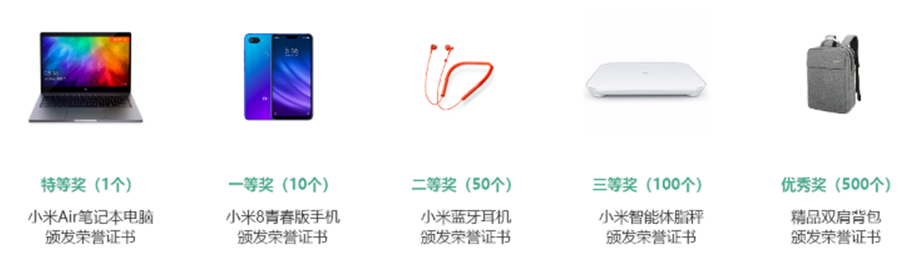 活动奖品丰富,参与活动将有机会获得小米笔记本电脑、小米8青春版手机、小米蓝牙项圈耳机、小米智能体脂称、精品背包等。