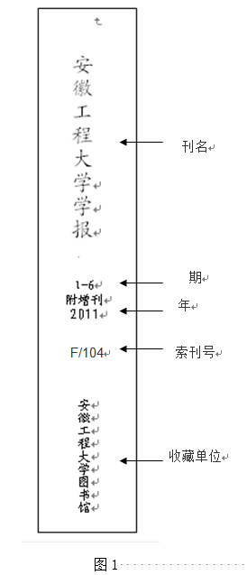 中文期刊刊名(包括副刊名等)、期(特殊说明,如增刊)、年、索刊号、收藏单位的名称(如安徽工程大学图书馆)等;
