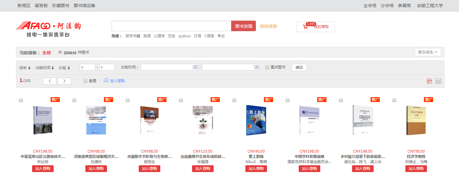 疫情终将过去,春天已然到来。在这个特殊时期,图书馆的“你选书,我买单”活动,在“云端”与大家见面啦!此次活动借助于北京人天书店有限公司主办的线上图书采购会(图采会)平台进行。此次图采会展示数百家出版社全品种数十万种新书资源。欢迎全校师生踊跃荐购图书,图书馆将根据教学科研需求,进行合理采购,补充馆藏。
