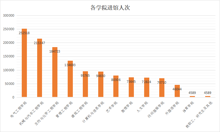 2019年读者进馆人次达1443372人次(备注:不包含主楼三楼四楼学习中心),意味着平均每天有4000人次进入图书馆。分学院来看,电气工程学院、机械与汽车工程学院、生物与化学工程学院、管理工程学院、建筑工程学院进馆人次位列前五。