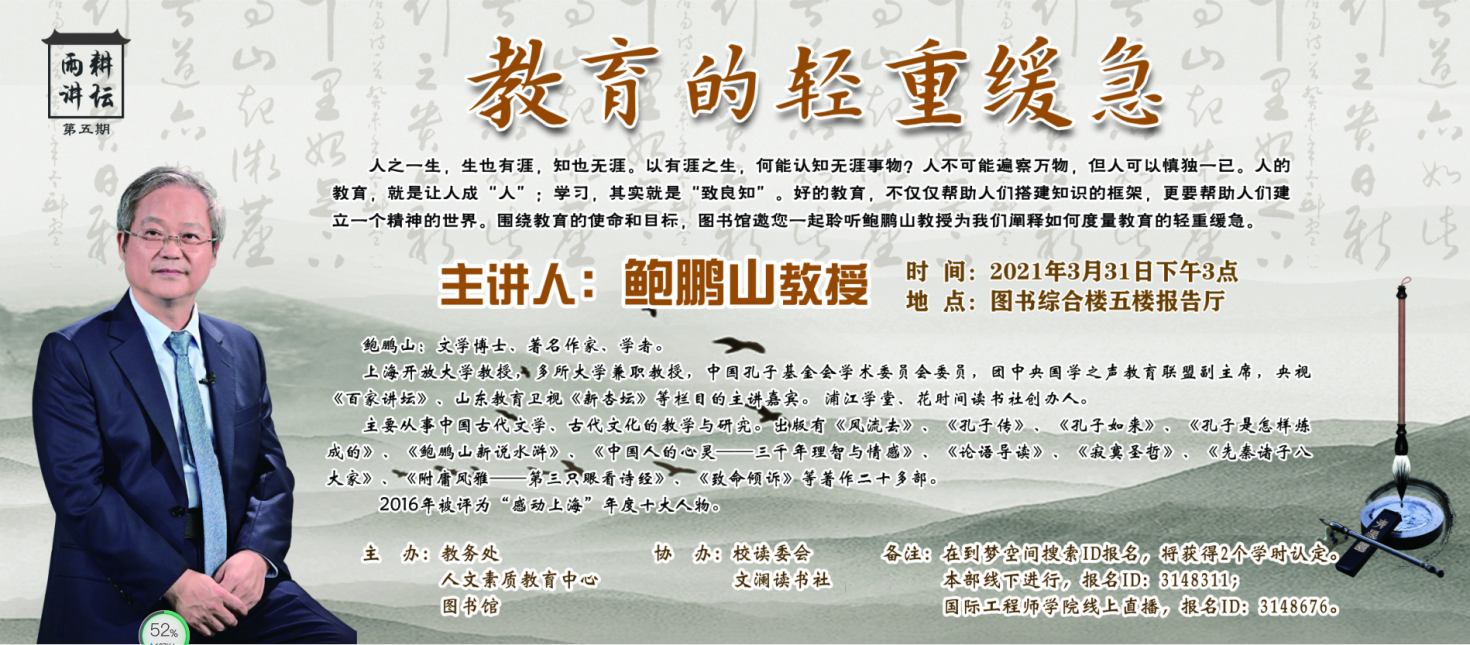 人之一生,生也有涯,知也无涯。以有涯之生,何能认知无涯事物?人不可能遍察万物,但人可以慎独一已。人的教育,就是让人成“人”;学习,其实就是“致良知”。好的教育,不仅仅帮助人们搭建知识的框架,更要帮助人们建立一个精神的世界。围绕教育的使命和目标,图书馆邀您一起聆听鲍鹏山教授为我们阐释如何度量教育的轻重缓急。