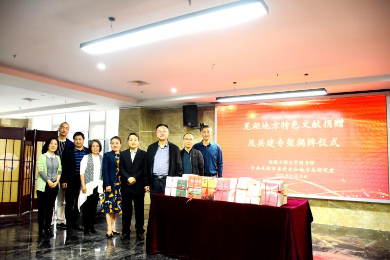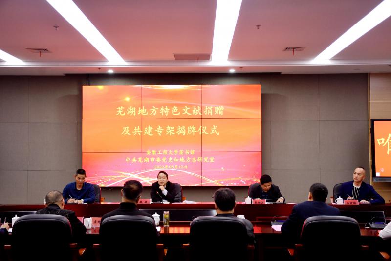为推进校市合作,共享地方特色资源,5月12日下午,学校图书馆与市委党史和地方志研究室在图书综合楼201会议室召开会议并举行图书捐赠和“芜湖地方特色文献专架”揭牌仪式。芜湖市委党史和地方志研究室主任魏超一行,副校长叶常林及相关学院负责人出席了本次活动。活动由图书馆馆长王忠群主持。