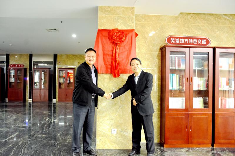 叶常林和魏超共同为“芜湖地方特色文献专架”揭牌。
