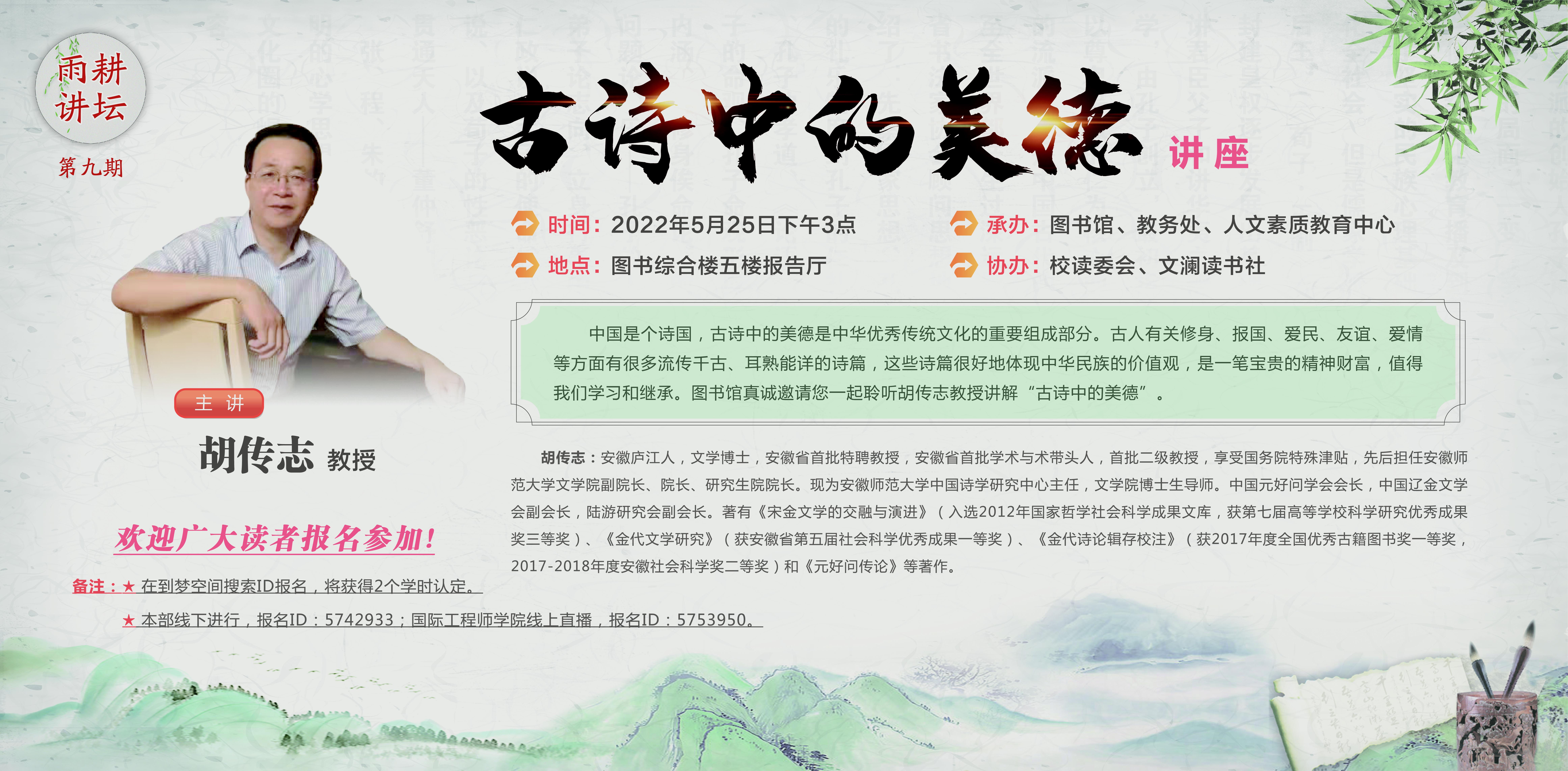 中国是个诗国,古诗中的美德是中华优秀传统文化的重要组成部分。古人有关修身、报国、爱民、友谊、爱情等方面有很多流传千古、耳熟能详的诗篇,这些诗篇很好地体现中华民族的价值观,是一笔宝贵的精神财富,值得我们学习和继承。为此,图书馆真诚邀请您一起聆听胡传志教授讲解“古诗中的美德”。