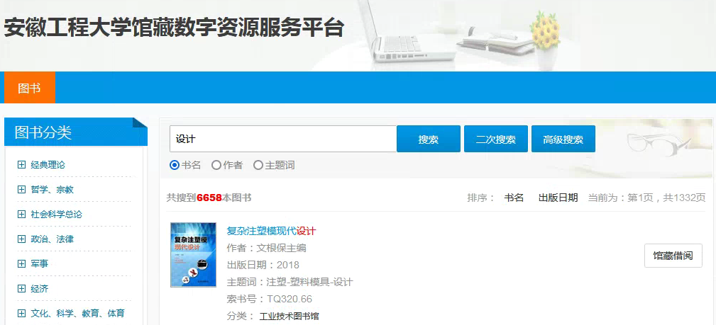 2、可通过左侧分类树或者检索方式找到需要的图书,点击书名查看目录页或点击‘馆藏借阅’借阅数字副本,邮箱收到数字副本邮件在学校ip范围内下载即可。