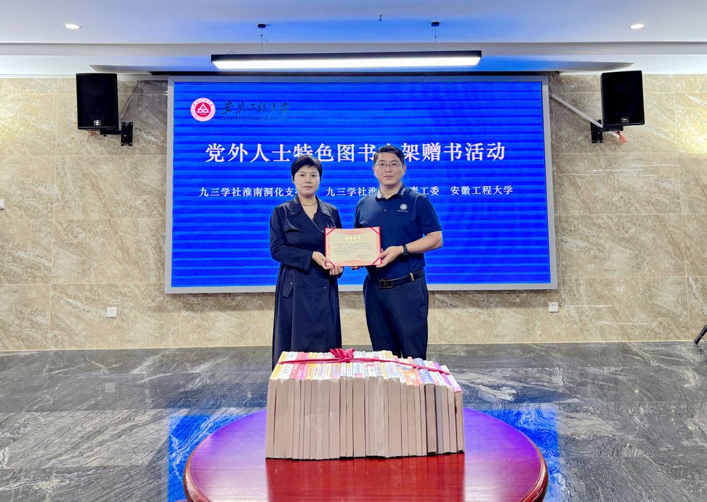 9月21日,九三学社淮南洞化支委会、九三学社淮南市委青工委向学校党外人士特色图书专架捐赠图书仪式在学校图书馆文澜阁举行。九三学社安徽省委会常委、副校长王成军,九三学社淮南洞化支委会主委姚娜,九三学社淮南市委青工委主任蓝祝,九三学社芜湖市委副主委杨如意出席。
