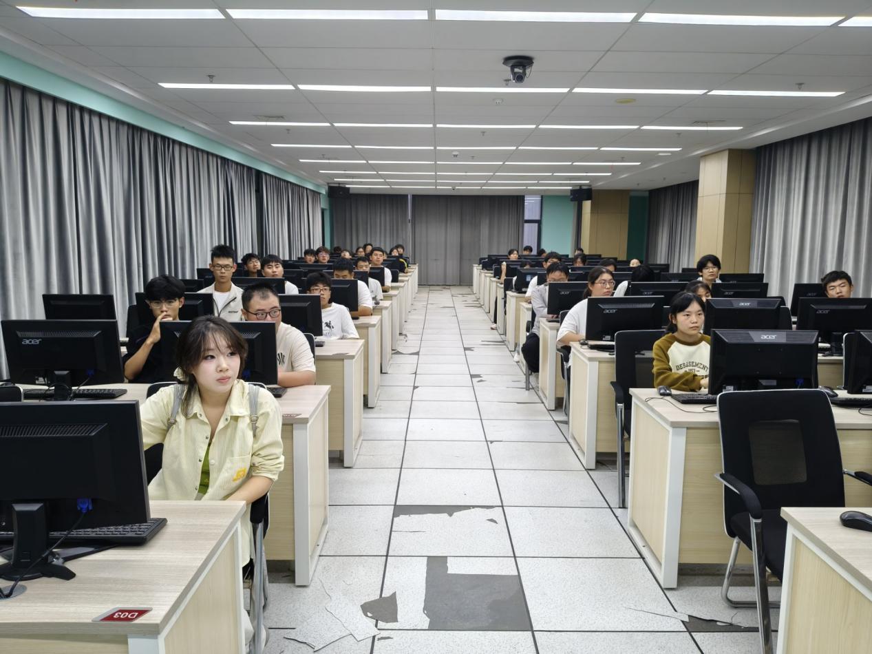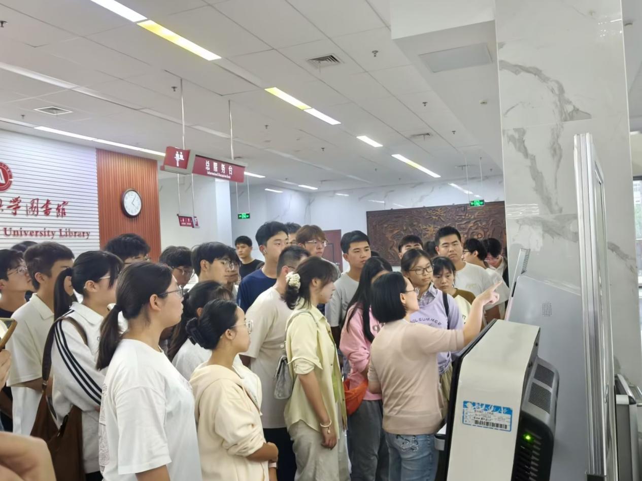 本次活动分为两个环节。第一环节为“集章自助参观”,新生可在总服务台领取参观卡片,按规定时间前往图书馆各服务窗口加盖印章,自主完成对图书馆的探索。第二环节为“讲解导览”,由图书馆工作人员张耀带领新生实地走访借阅区及特色区域,详细介绍入馆须知、馆藏分布、资源检索方法、图书借阅规则,并现场演示自助借还书机、歌德电子书借阅机等设备的使用。参观结束后,同学们在图书馆五楼多媒体教室参加了限时竞答活动。