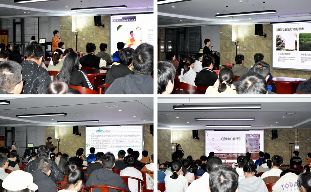 在学生共读环节,环工241班余思博、高成坤,环工242班付华青、邹曼佳四位同学结合阅读感悟与专业认知分享见解。余思博认为卡逊的智慧在于唤醒人类“整体生态思维”,呼吁“保护自然从不是遥远口号,少用塑料袋、优先选择有机蔬菜等微小举动,都是在为守护自然助力”;高成坤围绕环境问题根源、现代生活方式影响及未来发展方向展开思考,强调可持续发展的重要性,提议“科技进步应服务于环境保护,加大清洁能源与环保技术研发力度”;付华青被卡逊“身患重病仍冲破阻碍、以生命为炬为真理发声”的勇气震撼,指出著作不仅唤醒全球公众环保意识,更推动多国环保政策变革,价值历久弥新;邹曼佳表示阅读是“震撼且沉重的精神洗礼”,直言这部环保警示之作让自己深刻认识到“环保是人类生存的必然选择,人与自然和谐共生才是文明延续的正道”。