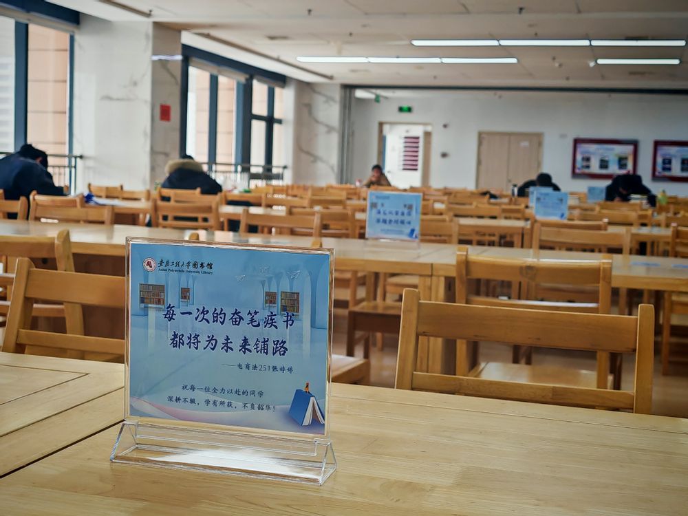 随着考研日渐临近,为给备考学子营造一个更温暖、更鼓舞人心的学习环境,图书馆与校学生读者工作委员会共同发起了“桌面提示语征集活动”,并将精选出的暖心标语制成桌牌,放置在阅览区的自习座位上,成为陪伴同学们的无声伙伴。