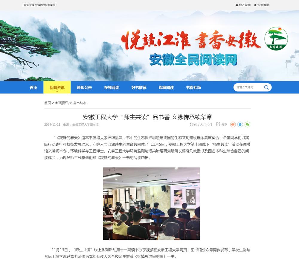 近日,安徽省第九届校园读书创作活动评审结果正式公布,共计批复20项,我校“师生共读”品牌活动从全省高校、中学、小学报送的众多项目中脱颖而出,成功获评安徽省“校园阅读推广活动”荣誉,成为全省5所获此殊荣的高校之一。