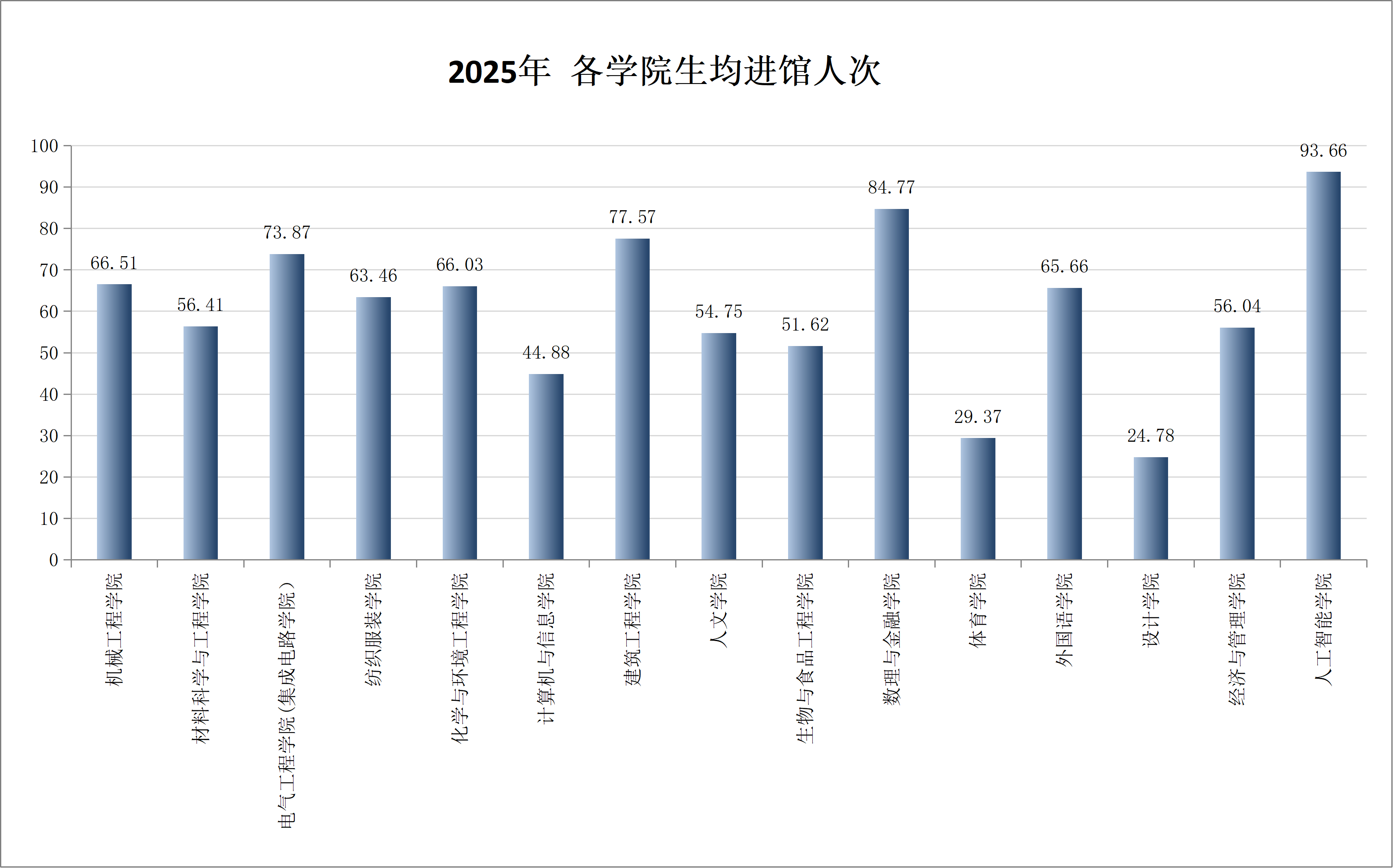 《报告》显示,2025年,图书馆借出图书16248册,较上年增长28.64%。工业技术类图书借阅量最高,达5362次,其次为文学类图书(3678次)和数理科学和化学(1081次),历史地理(1018次)与语言文字(876次)也有较高需求。整体趋势呈现以专业学科为核心、辅以人文阅读的特点。社会科学类图书占比54%,显示出读者对此类知识资源的较高关注度;自然科学类图书占比43%,同样保持稳定需求。移动图书馆年访问量4095415次。电子图书阅读量117574次,其中歌德电子书借阅机使用最为活跃,借阅量达54006,占阅读总量的46%。中外文电子资源总访问量约300万次 ,中国知网、Elsevier SD、新东方多媒体数据库、SCI、网上报告厅使用量位居前五;图书馆主页访问量781628人次,较上年增长23.88%。图书馆进馆人次达136万余人次,较上年增长36.81%。生均进馆次数排名前三学院为:人工智能学院、数理与金融学院和建筑工程学院;图书馆团体研修室使用521场,3662人次。文澜阁使用24场,2283人次。多媒体教室使用14场,967人次。多媒体视听室使用24场,1223人次。